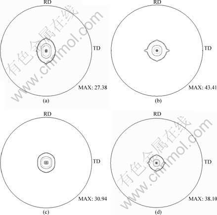 Fig.4 (0002) pole figures of rolled AZ31 sheet: (a) UR, 2.99 mm, (b) CR, 2.99 mm, (c) UR, 1.38 mm, (d) CR, 1.38 mm