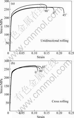 Fig.5 Stress—strain curves of unidirectionally rolled (a) and cross rolled (b) AZ31 sheets at room temperature with a strain rate of 5×10-3 s-1