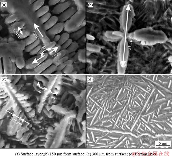 图5所示为纯氮气气流量15 L/min时渗氮层不同部位的SEM像。由图5(a)可以看出,渗氮表层二次枝晶间距较大为3.5 μm,近表层渗氮层等轴晶中枝晶长度较短为21.5 μm(见图5(b)),熔池底部渗氮层二次枝晶间距较小为1.35 μm(见图5(c)),渗氮层与热影响区交界区域针状晶较细长(见图5(d))。针状晶为熔池底部和基体相连接热影响区组织,根据XIN等[13]研究结果这种组织为α′-Ti,为快速冷却时有部分氮元素渗入的马氏体组织。