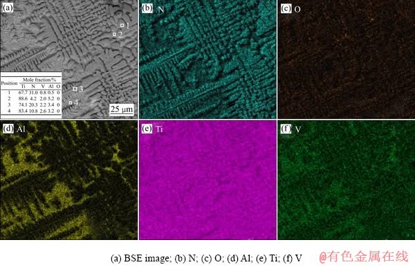 图6所示为纯氮气气流量15 L/min时渗氮层内距表层200 μm处组织各元素的分布。从图6中可以看出,激光渗氮时,在树枝晶枝干上氮的浓度升高,出现明显的偏聚现象,而铝和钒出现贫化现象,氧则含量较少。粗枝晶上氮含量为31.0%(摩尔分数),细枝晶为20.3%,枝晶间为4.2%(见图6(a))。