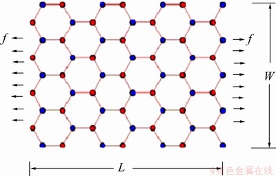 建立如图1所示模型。沿扶手椅型石墨烯纳米带(AGNR)的扶手椅边沿施加一微小单轴应力f,f与石墨烯纳米条带处于同一平面且拉伸时非常缓慢,可以看作一静力。假设模型中石墨烯纳米带的带宽W足够宽,以致可以将石墨烯纳米带看作是1个石墨烯面,并且石墨烯纳米带的长度L相对宽度W来说无限长,即L>> W。由于应力在拉伸时非常缓慢且石墨烯纳米带L>> W,所以,可以忽略石墨烯纳米带带长的收缩。