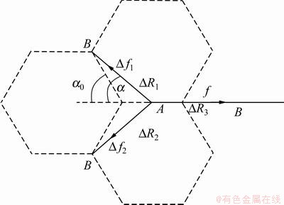 扶手椅型石墨烯纳米带受到沿扶手椅边沿的单轴应力拉伸时,在只考虑最邻近相互作用的情况下,利用静力学方法,对任意1个碳原子进行受力分析,如图2所示,其中:f为拉力分配到每个碳原子上的力;△f1和△f2为相邻碳原子因键长发生变化而产生的力;