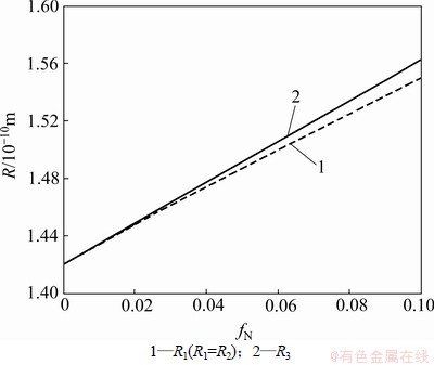 Fig.4 Relationship between bond-lengths R and dimensionless physical quantity fN under uniaxial strain