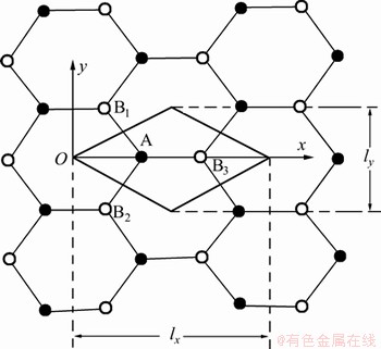图5所示为沿扶手椅边沿方向的单轴应力作用下石墨烯纳米带元胞模型,其中:lx和ly表示均匀应变下扶手椅型石墨烯纳米带的平行四边形元胞的2条对角线长度;黑、灰两色的小球A和B代表子格点。在外加微小的单轴应力作用下,体系费米能级附近的电子态仍然主要由形成σ键的2pz轨道决定,并且石墨烯纳米带的电子结构可以用紧束缚近似下的π轨道来描述。因为在均匀单轴应变下,理想完整宽度为m-AGNRs的晶格周期性仍然保持与非应力作用下的情形一致。