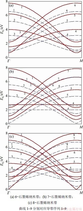 对称分布,所以,约有1.34 eV的带隙;如图9(b)实线所示,半导体型7-扶手椅石墨烯纳米带的导带序列为1,2,3,4,7,6和5,带隙为1.28 eV;如图9(c)实线所示,金属型的8-扶手椅石墨烯纳米带的导带序列为l,2,3,4,8,5,7和6,没有能隙。