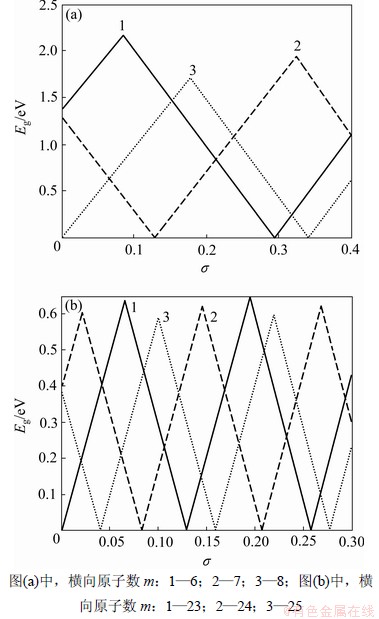 下面探讨扶手椅石墨烯纳米带能隙与单轴应力的关系。扶手椅石墨烯纳米带的能隙Eg可以通过下式计算: