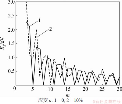 由图10可知:在沿扶手椅边沿的单轴应力作用下,扶手椅石墨烯纳米带的能隙随应变呈线性的周期性变化,并且表现出明显的震荡现象;可达到的最大能隙随应力增大有所增大,且最大能隙随条带横向原子数(条带宽度)m增大而减小。由图11可知:应变下扶手椅石墨烯纳米带的能隙总的变化趋势是随着m的增大而减小,在m较小的区域急剧振荡变化,如图11中曲线1所示;在非应变下,理想的扶手椅石墨烯纳米带能隙随横向原子数m以3为周期发生金属—半导体转变,并振荡下降;如图11中曲线2所示。由于应变下纳米带结构对称性降低,扶手椅石墨烯纳米带不再有上述周期性的变化规律,这与文献[10]中的研究结果一致。可见:扶手椅石墨烯纳米带的能隙可以通过外加应变进行有效调控,并有望应用于应力传感器等方面的设计[15-19]。