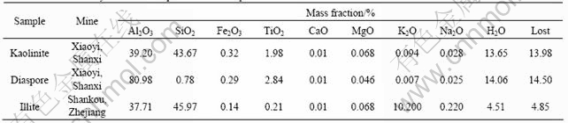 The pure mineral samples of diaspore, kaolinite and illite come from different mines of China. The samples were hand-picked, ground by porcelain mill and screened to less than 0.074 mm. The chemical compositions of these samples are listed in Table 1.