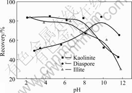 Fig.2 Flotation recoveries of diaspore, kaolinite and illite as function of pH at DEN12 concentration of 2×10-4 mol/L