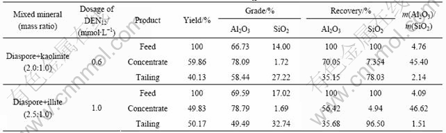 For the mixture of diaspore and kaolinite (mass ratio 2.00?1.00), the mass ratio of Al2O3 to SiO2 in feed is 4.76, which is beneficial to obtaining a concentrate with the mass ratio of Al2O3 to SiO2 45.4, and a recovery 70.05%, in the presence of DEN12. For the mixture of diaspore and illite (2.50?1.00), the mass ratio of Al2O3 to SiO2 in feed is 4.09, after flotation separation using DEN12 as a collector, the mass ratio of Al2O3 to SiO2 in concentrate obtained reaches 46.62 with a recovery of 56.42%, which suggests that the synthesized DEN12 can be used as a collector for reverse flotation of diasporic bauxite.