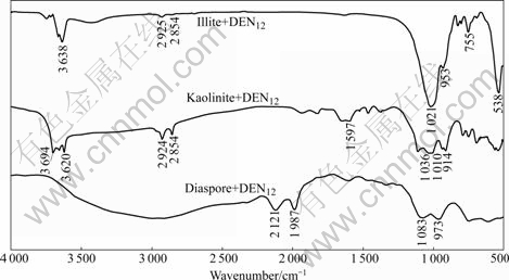 are negatively charged in wide pH range, the physical adsorption of cation collector DEN12 may be due to the electrostatic interaction. The strength of the peaks at 2 924 and 2 854 cm-1 on kaolinite is stronger than that on illite, accounting for the stronger adsorption and collecting action of DEN12 on kaolinite than on illite. The spectrum of diaspore treated by DEN12 exhibits weak peaks from 1 300 to 1 600 cm-1. No band shift is observed, indicating the adsorption of DEN12 on diaspore is dominated by weak physical adsorption.