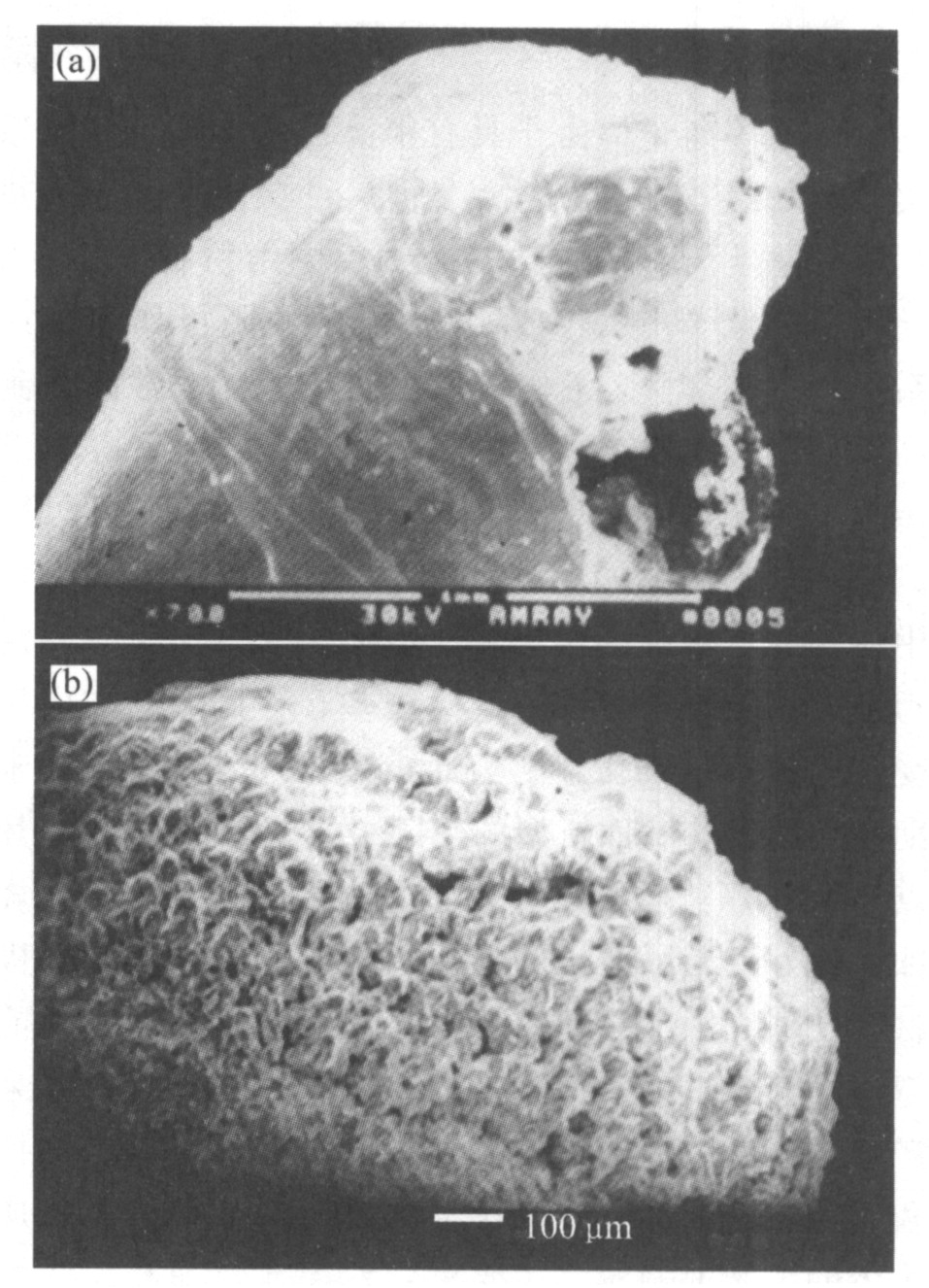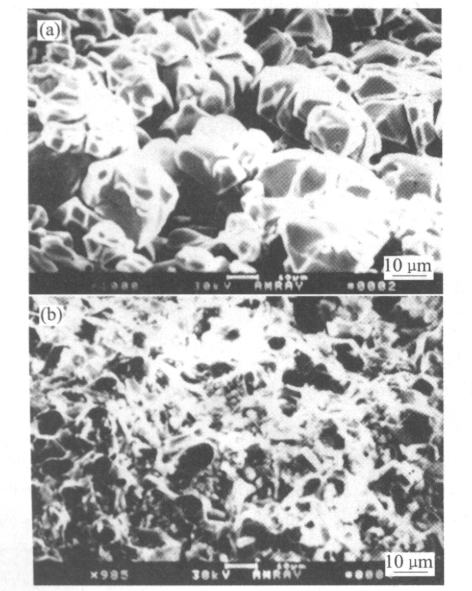 Fig.3 SEM microstructures of W-La2 O3 after arc burning (a)—Vicinity burning arc area; (b)—Removed burning arc area