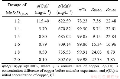 As indicated by Reaction (3), nickel will present in the residue and the concentration of manganese in the solution will increase after the reaction. It is evident that MnS dosage should be optimized. The experimental results show that the optimal MnS dosage is (1.4-1.6)Dt,MnS.