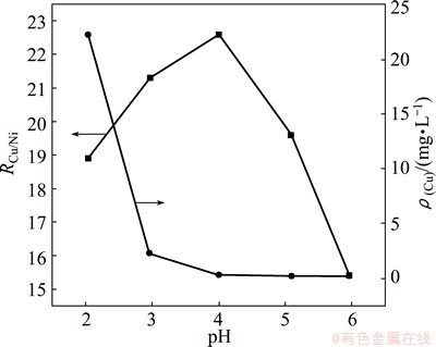 H2S is released from the solution, which leads to a higher residual copper concentration and a lower ratio of copper to nickel in the residue. Additionally, HS- can combine easily with Cu2+ ions to form coordination complexes Cu(HS)+ ions under low pH values, preventing CuS precipitation [15,16]. At pH 4, the mass ratio of copper to nickel in the residue reaches the maximum. This suggests that the reaction between free S2- and Cu2+ ions in the solution is completed and there are insufficient free S2- ions which can react with Ni2+ ions. With the increase of pH value (pH≥4), a gradual decrease in residual copper concentration in the electrolyte is observed. The copper concentration is lower than 3 mg/L that meets production requirements. The concentration of Mn in the solution decreases with increasing pH value. This indicates that the more manganese precipitation forms at a higher pH value, the less manganese goes to the solution.