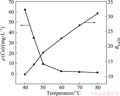 Figure 4 shows the effect of reaction temperature on residual copper concentration (ρ(Cu)) and on the mass ratio of copper to nickel (RCu/Ni) in the residue. ρ(Cu) decreases with increasing reaction temperature while the variation of RCu/Ni shows an opposite tendency. This indicates that Cu2+ ions easily react with S2- at high temperatures. For example, ρ(Cu) in the electrolyte decreases from 61.83 mg/L at 40 °C to 2.43 mg/L at 60 °C. It subsequently keeps ~1 mg/L when temperature is higher than 60 °C. In contrast, RCu/Ni increases from 10.68 at 40 °C to 22.61 at 60 °C and to 31.02 at 80 °C. Inspection of the data suggests that ρ(Cu) and RCu/Ni at 60 °C meet production requirements. Thus, one may expect that the optimum temperature for copper removal is 60 °C.