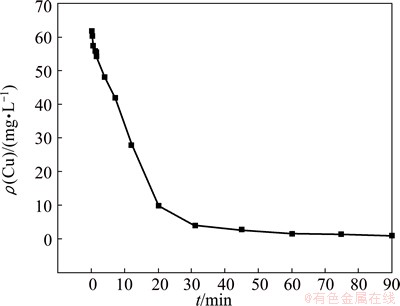 Figure 5 shows the effect of reaction time on the residual copper concentration. ρ(Cu) decreases substantially in the reaction time period up to 20 min. It then decreases slowly with increasing reaction time. This is due to the reaction between S2- and Cu2+. The formation of CuS precipitate leads to a sharp decrease in copper concentration. With the extension of reaction time, the copper concentration decreases. The copper reaction rate and copper concentration decrease slowly if the reaction time is further extended. It thus becomes far more difficult for S2- ions to react with Cu2+ ions. ρ(Cu) is as low as 1.6 mg/L at 60 min, so optimum reaction time appears to be approximately 60 min.