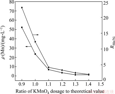 Figure 6 shows the effect of KMnO4 dosage on demanganesing under the conditions of 0.42 g/L Mn2+, 0.1 mol/L KMnO4 and pH 5.0. It is found that the demanganesing rate increases and the residual manganese concentration decreases by adding KMnO4 to the solution after copper removal. The mass ratio of manganese to nickel in the residue also decreases, suggesting that nickel was oxidized and precipitated. For example, the residual manganese concentration and the mass ratio of manganese to nickel are respectively 52.24 mg/L and 23.1 at KMnO4 dosage of 0.9 times the theoretical value Dt,KMnO4 (Dt,KMnO4=0.81 g KMnO4). The contents of Mn and Ni in the residue are 60.65% and 2.60%, respectively. The residual manganese concentration and the mass ratio of manganese to nickel, respectively decrease to 1.24 mg/L and 2.47 when the dosage increases to 1.3Dt,KMnO4. This is due to the reaction between MnO4- and Mn2+ ions, as indicated by Reaction (6).