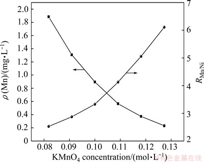 Figure 7 presents the effect of KMnO4 concentration on the residual manganese concentration and the mass ratio of manganese to nickel under the conditions of 0.42 g/L Mn2+ and 1.4Dt,KMnO4. It is seen that the residual manganese concentration increases and the mass ratio of manganese to nickel decreases as the KMnO4 concentration increases. This is because the higher the concentration of potassium permanganate is used, the more the nickel is oxidized in the nickel solution. In fact, black nickel precipitate (Ni2O3) is easily generated [19,20]. The content of newly generated MnO2 may be reduced. Therefore, the residual concentration of manganese should be properly controlled at a low level (about 1 mg/L) by using KMnO4 with concentration less than 0.11 mol/L.