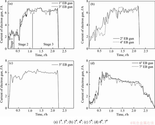 经过多次试验分析,得出结论:获得成分均匀铸锭时,物料熔化区、精炼区、凝固区所需功率(电流×电压,电压恒定为30 kV)占比基本稳定在某一范围内。正常熔炼过程中,物料熔化区(1#~4#电子枪)获得功率占总功率的50%,精炼区(5#电子枪)功率占比为20%,凝固区功率占比为30%。