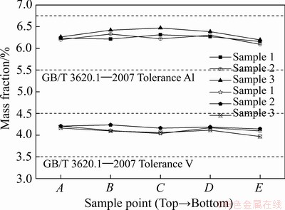 2) 铸锭中轴向化学成分分布均匀性良好,V元素分布优于Al元素的分布;Al元素标准差在0.25%以内,V元素标准差在0.10%以内。径向成分分布则相对均匀,Al元素标准差在0.18%以内,V元素标准差在0.10%以内。