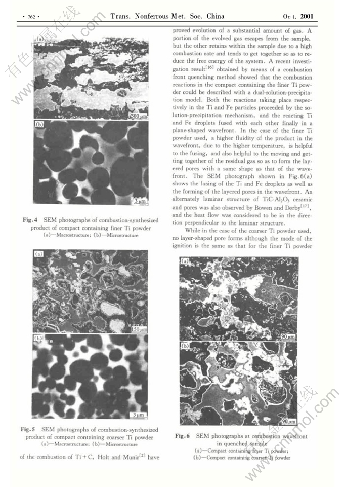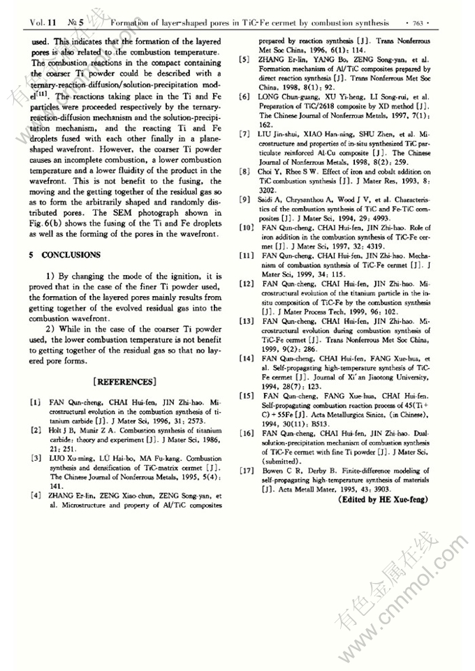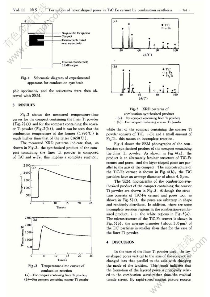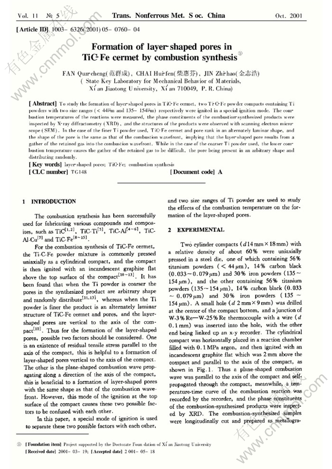 Key words:layer-shaped pores; TiC-Fe; combustion synthesis