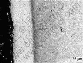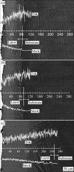 The cross-section BED images and line scanning maps of the composite anodes are shown in Fig.2, which depicts a diffusion depth of Mn (light areas) in Ti (dark areas) substrate. Apparently, the manganized layer of the Ti-based Ti-Mn composite consists mainly of two layers, which are Mn-rich layer close to the surface and acicular Mn-diffusion layer close to the substrate. The contents of Ti and Mn in the manganized layer exhibit gradient changes. Moreover, there is no obvious interface between the coating and substrate, indicative of good metallurgy bonding between them. XRD result shows that the Mn-rich layer is TiMn2, and the acicular Mn layer is α+β alloy, which coincide with the previously reported results [19-20]. The BED image of the new anode sintered at 950 °C followed by water quenching instead of furnace cooling is shown in Fig.3, which reveals three clear gradient layers corresponding to TiMn2 intermetallic, Ti-Mn solid solution and Ti substrate (from surface to the substrate). This result reveals that α phase is formed as a precipitated phase from super-saturated β solid solution along the grain boundary during the furnace cooling process, and this leads to the formation of α+β alloy layer.