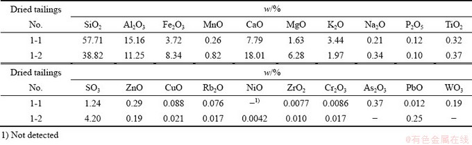 钨矿和铅锌矿尾矿经研磨后湿筛、干燥处理后采用盐酸溶液酸浸除杂得到酸浸尾矿。表1所示为干化尾矿组分的XRF分析结果。尾矿1-1为钨矿尾矿,尾矿1-2为铅锌矿尾矿,组分含量以氧化物表示。由表1可知,两种干化尾矿主要的氧化物组成为SiO2,含量分别为57.71%和38.82%。其次为Al2O3和CaO,两者Al2O3含量分别为15.16%和11.25%;CaO含量分别为7.79%和18.01%。然后是少量的Fe2O3、MnO、MgO、K2O和SO3,这五种氧化物的含量在1.24%~8.34%之间。最后为微量的As2O3、PbO、Cr2O3、Na2O、P2O5、TiO2、ZnO、CuO、Rb2O、NiO、ZrO2、WO3等其他组分。两种尾矿的成分复杂,各种成分的含量均有差异,不过尾矿中利用价值较高的氧化物(SiO2和Al2O3)含量总和高于50%。