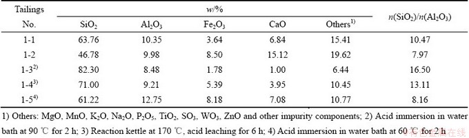 表2所示为干化尾矿及其酸浸尾矿组分的ICP分析结果。尾矿1-3为酸浸钨矿尾矿,尾矿1-4为酸浸铅锌矿尾矿,尾矿1-5为除钙铅锌矿尾矿,组分含量以氧化物表示。由表2可知,尾矿1-1和尾矿1-2的元素组成中,除Al2O3含量基本相近外,其他元素的氧化物含量均差异较大。尾矿1-2的SiO2含量比尾矿1-1的SiO2含量低,两者分别为46.78%和63.76%,尾矿1-2的非硅铝质组分Fe2O3和CaO含量是尾矿1-1中Fe2O3和CaO的含量的2.2~2.3倍,表明尾矿1-1的硅铝比更高,杂质更少,可能更易于用来合成ZSM-5等介孔分子筛材料。