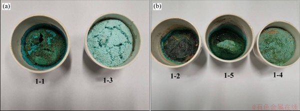 图1所示为两种尾矿及酸浸尾矿高温碱熔活化实物图。由图1可知,两种尾矿在未经酸浸除杂时的直接高温碱熔活化(尾矿1-1和1-2)均呈现颜色偏深的烧结板块现象,破碎较困难,酸浸尾矿活化后(尾矿1-3和1-4) 呈现浅蓝色的蓬松状,稍加研磨便可粉碎,因此需在高温碱熔活化前对尾矿进行酸浸除杂处理。
