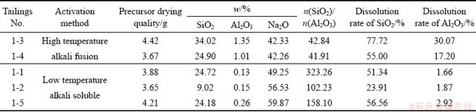 从两种活化方式来看,酸浸尾矿经过高温碱熔活化(尾矿1-3和1-4)处理之后前驱液的n(SiO2)/n(Al2O3)大约为42,然而低温碱溶活化(尾矿1-1、1-2、1-5)处理之后前驱液的n(SiO2)/n(Al2O3)大于100。这说明,本工作中的低温碱溶条件不足以使大部分的晶相Al2O3溶解,导致Al2O3溶出率较低,所以其n(SiO2)/n(Al2O3)比高温碱熔的要高很多。