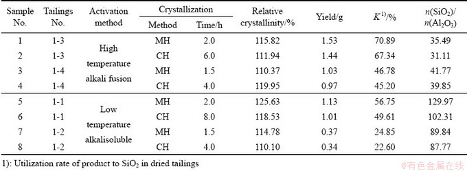 如表4可知,高温碱熔活化预处理时,尾矿1-3采用MH法合成时,仅需2 h的晶化时间就可以达到相对结晶度为115.82%的产物(样品1),采用CH法合成时,其产物(样品2)达到接近于MH法产物的相对结晶度的晶化时间为6 h(111.94%),即CH法合成所用时间为MH法的3倍,表明采用MH法合成可以明显缩短晶化时间。