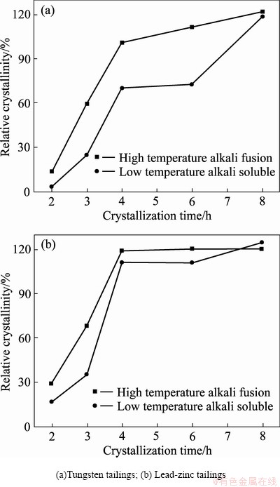 图4 两种尾矿不同活化预处理后常规水热合成产物的晶化曲线