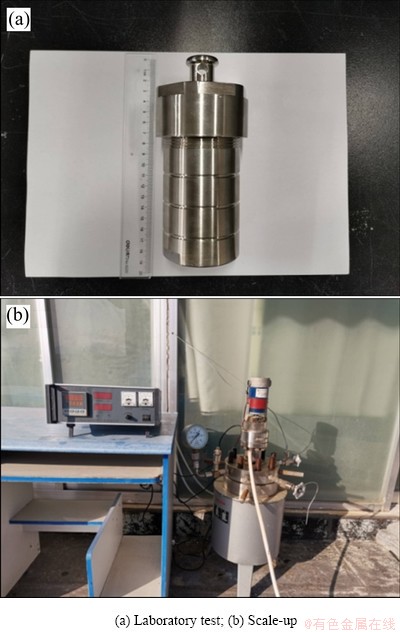 为便于上述试验结果转化为工业生产应用,本工作进一步试验上述尾矿资源化利用工艺的放大,以探索工艺路线的稳定性和可行性,分析控制工艺参数及操作条件的优化设计。小试和小试放大所用的反应釜如图7所示,容积分别为100 mL和1 L。100 mL反应釜为静态晶化反应;1 L反应釜带电机搅拌器,晶化时为动态搅拌晶化,电机搅拌转速为130 r/min。