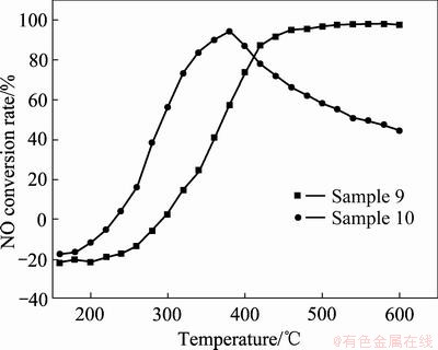 图10所示为小试放大产物催化剂对NO转化效果曲线图。在原料气组成为(体积分数):O2 3.06%、NH3 8.36%、NO 7.54%、N2 81.04%;混合气空速为1.0×105 mL/(g·h)的条件下模拟对NO进行脱硝还原。由图10可以看出,样品9产物催化剂的NO转化效率随着温度的提高先升高后趋于平缓,560 ℃时达到最高点,为97.69%,样品10产物催化剂的NO转化效率随着温度的提高先升高后降低,380 ℃达到最高点,为94.31%。说明所合成ZSM-5分子筛产物有较好的催化活性,由表6中产物样品9和10的Fe2O3含量分别为0.37%和0.16%,可以发现Fe2O3含量较高的样品9产物有较好的高温活性。