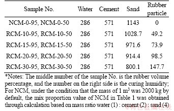 Ordinary Portland cement and tap water were used in the test. Natural river sand was utilized as the fine aggregate, with a maximum particle size of 5 mm, a fineness modulus of 2.6, and a density of 2600 kg/m3. The rubber fine aggregate (20 mesh) used in the test came from waste tire rubber, and its density was 1120 kg/m3. The rubber aggregate underwent internal mixing, and volume fractions of 0%, 10%, 15%, 20%, and 30% were substituted for sand. The mix proportions of NCM and RCM specimens are listed in Table 1 [25-27].