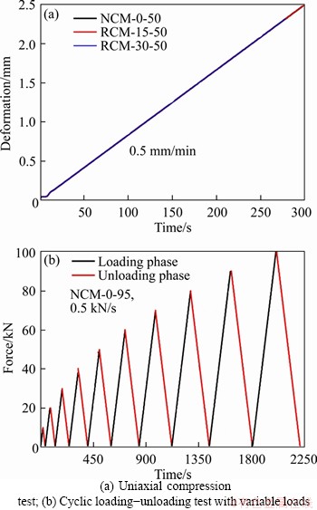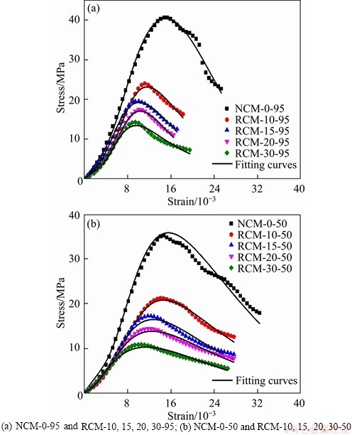 Interestingly, curing conditions (such as the curing humidity) have a strong influence on the hydration products of a CBM and can play a key role in its performance [16, 17]. In this connection, specifically, dry-curing leads to an increase in the total porosity and pore volume of concrete, while it significantly reduces its compressive strength compared with wet-curing [18]. LUO et al [19] believed that this significant increase in porosity under dry-curing conditions may be due to the concrete’s loss of free water to the surrounding environment, which reduces the hydration degree of cement and the filling effect of hydration products on pores. However, inevitably, due to the variability and complexity of the actual construction environments, it is difficult to meet standard curing conditions. Therefore, initial damage inside engineering structures occurs, adversely affecting the mechanical properties and durability and causing safety hazards. To explore the effect of curing humidity on the fracture properties of concrete materials, MI et al [20] proposed a maturity model considering the coupling effect of curing temperature and humidity by introducing an innovative humidity rate function, which can accurately predict the fracture properties of concrete. SHEN et al [21] believed that the decrease of the internal relative humidity of high-performance concrete will cause autogenous shrinkage. To evaluate the cracking resistance of high-performance concrete, a relative humidity model of early-age internally cured concrete was established, and the model has good accuracy. According to the principle of humidity compensation, LYU et al [22] proposed a method to control shrinkage and anti-fracture. Finally, the enhancement mechanism of cement hydration was revealed by SEM. In addition, to study the effect of rubber content and particle size on the mechanical properties of concrete, LI et al [23] carried out uniaxial compression tests on rubber concrete and analyzed the strength, elastic modulus, peak strain, ultimate strain, the appearance of visible cracks, and the failure mode of specimens. Finally, based on the GB50010-2002 standard, a uniaxial compression constitutive model that can characterize the mechanical characteristics of low volume rubber concrete was established [23]. To study the brittle-ductile transition and mechanical properties of cement mortar, WANG et al [24] carried out a series of tests such as triaxial cyclic loading-unloading. Based on the analyses and discussions of strength and deformation characteristics, an elastic-plastic model was established by using the principle of effective stress, and the effectiveness of the model is verified by comparing the simulation results with the experimental results [24].