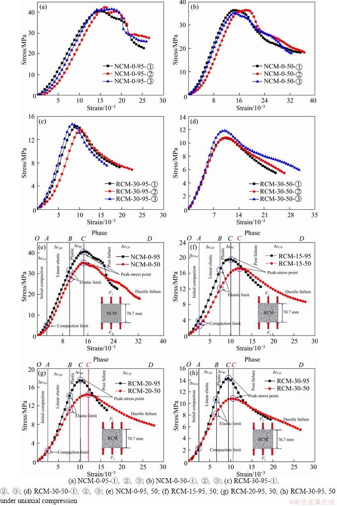 To better describe the compression failure evolution characteristics of NCM and RCM under dry- and wet-curing conditions, using NCM-0-95, 50, RCM-15-95, 50, RCM-20-95, 50, and RCM-30-95, 50 as examples. One can distinguish four evolution stages in the stress-strain curves: the initial compaction stage (OA), linear elastic stage (AB), plastic stage (BC), and post-peak failure stage (CD) (Figures 2(e)-(h)). Point D represents the ending point of the post-peak descending section of the stress-strain curve,which varies in each specimen. It can be noted that the initial compaction stage (△εOA) BC)