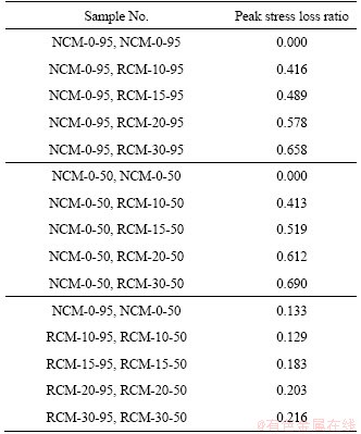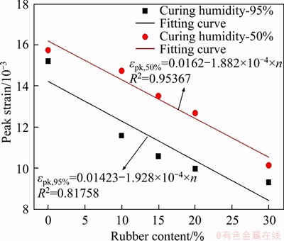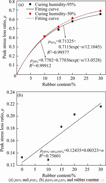 It can be observed from Table 2 that, under the curing conditions of 95% and 50% relative humidities, the peak stress loss ratio of the specimens increases with the increase of the rubber content. Figure 3(a) shows that there is an ideal exponential relationship between the peak stress loss ratio and rubber content. It can be seen that the peak stress loss ratio for dry curing is slightly larger than for wet curing (see Figure 3(a)). For specimens with the same rubber content under the conditions of 95% and 50% curing humidities, Figure 3(b) shows that, there is a positive correlation between the peak stress loss ratio and rubber content. It can be observed that the peak stress loss ratio of specimens with the same rubber content due to the decrease of curing humidity increases with the rubber content (see Figure 3(b)).