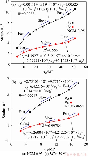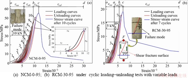 Figure 5 represents the stress-strain curves and the failure modes of specimens NCM-0-95 and RCM-30-95 under cyclic loading-unloading tests with variable loads. The NCM-0-95 and the RCM-30-95 were loaded and unloaded to the failure endpoint, step by step under the variable load values of 10 and 5 kN, respectively. As can be seen from the figure, the stress-strain curves of the NCM-0-95 and the RCM-30-95, under cyclic loading-unloading tests with variable loads, have the same evolution characteristics (see Figure 5). Indeed, with the increase of load grade stress (σB), the load grade strain (εB) and cumulative residual strain (εC) increase in a polynomial manner, showing a trend of “fast, slow and fast” (see Figure 6), which suggests that the specimens produce irreversible plastic deformation under each loading-unloading cycle. However, an obvious difference is observed between the failure modes of the NCM-0-95 and the RCM-30-95 under cyclic loading-unloading tests with variable loads. In fact, RCM-30-95 mainly experienced shear failure in the form of principal oblique cracks of about 70° (see Figure 5(b)). However, NCM-0-95 mainly experienced conical instability failure in the form of surrounding spalling. Of course, this failure mode is also caused by shear (see Figure 5(a)).