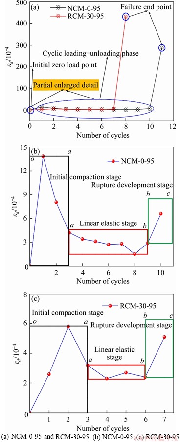 Figure 7 demonstrates the changes of residual strain differences (εd=εC,i-εC,i-1, i=1, 2, ...) produced by each cyclic level of the cyclic loading-unloading tests. The residual strain differences produced by the NCM-0-95 and the RCM-30-95 are the largest at the complete failure endpoint, which are 0.0288 and 0.0431, respectively. Figures 7(b) and (c) show that the same variation trend, i.e.the increasing-decreasing-increasing trend, was observed in the residual strain differences produced by each cyclic grade of the NCM-0-95 and the RCM-30-95 under cyclic loading-unloading tests with variable loads. Combined with the stress-strain curves in Figure 5, it can be seen from Figures 7(b) and (c) that the residual strain differences produced by each cyclic level are obvious in the oa stage, indicating that it belongs to the initial compaction stage of the loading process. In the ab stage, the residual strain differences produced by each cyclic level are small and stable, indicating that it belongs to the linear elastic stage of the loading process. In the bc stage, the residual strain difference produced by each cyclic level increases rapidly, indicating that it belongs to the fracture development stage in the loading process. Therefore, the evolution trend of the stress-strain curves of the specimens under the cyclic loading-unloading tests with variable loads can be described directly through the change of residual strain differences. From the strain evolution process of the specimens under cyclic loading-loading test, it positively reflects the irreversible load damage of the specimen under uniaxial compression.