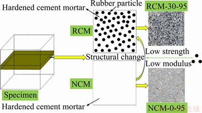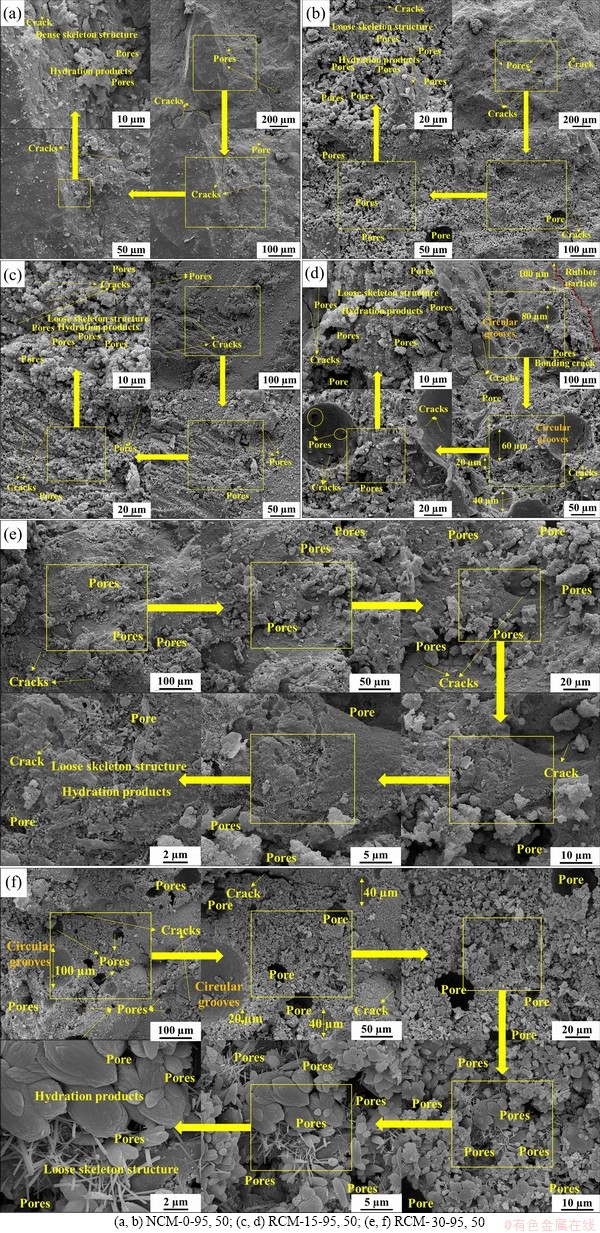 Although the RCBMs has many advantages, it is undeniable that rubber materials significantly weaken the strength and modulus of the CBMs, even under the standard curing conditions in the laboratory [11, 12]. In this connection, ZHANG et al [13] and ZHU et al [14] analyzed the internal microporous structures of RCBMs utilizing mercury intrusion porosimetry (MIP) and SEM. The results showed that the pore size and porosity of RCM were shown to increase with rubber content; the content of macropores (diameter d>1000 nm) increases the most, while that of gel pores (d<10 nm) does not change much, and when the rubber content is 5%, the total porosity of high-performance rubber concrete increases by 3.45% and the small pore volume of 10-100 nm is mainly controlled by rubber content. To promote the application of recycled crumb rubber concrete in civil engineering, GUO et al [15] studied the damage evolution process of recycled crumb rubber concrete (RCRC) under uniaxial compression by using a two-dimensional quantitative cloud image correlation method and a meso-numerical model on random aggregate.