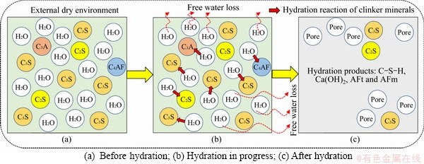 Figure 11 Schematic diagram of meso-hydration process of cement clinker minerals under dry-curing: