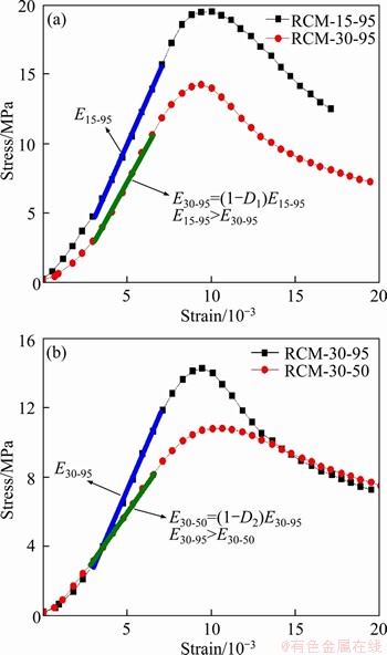 where σn is the stress on the RCM specimens with wet-curing (n=0, 10, 15, 20 and 30); σd is the stress on the specimens with dry-curing; σnd is the stress on the RCM specimens with dry-curing; E0 is the elastic modulus of NCM specimens with wet-curing (n=0); Ew is the elastic modulus of specimens with wet-curing; Dn is the damage caused by the rubber particles (n=0, 10, 15, 20 and 30); Dd is the damage caused by the dry-curing; Dnd is the damage caused by the rubber particles and dry-curing.