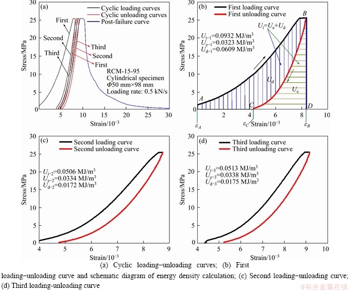 To better analyze the damage from the perspective of energy, the cyclic loading-unloading test with equal load was carried out on the cylindrical specimen (Φ 50 mm×98 mm) RCM-15-95 (see Figure 13). Based on our results, the loading curve and unloading curve of each cycle do not coincide, which indicates that in addition to the transformation of part of the external work into elastic energy that can be released, the rest of the external work drives the material to produce plastic damage deformation and consume energy. Therefore, the ratio of damage energy density Ud to input energy density Ui under an external force can be taken as a damage variable [42]. According to the calculation principle of energy density (see Figure 13(b)), the input energy density Ui, elastic energy density Ue, and damage energy density Ud can be calculated, as follows [26, 42]: