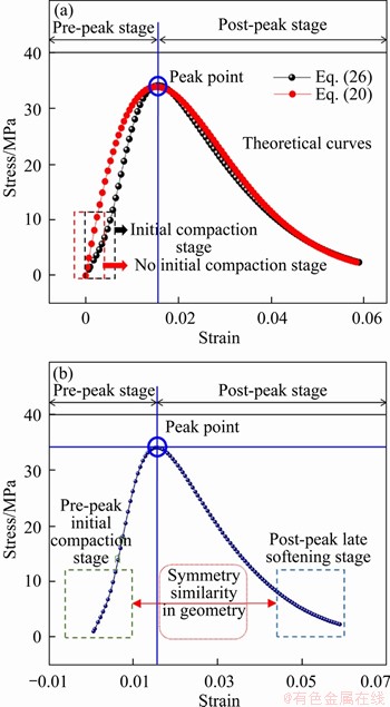 Figure 14 Difference of theoretical curves in initial compaction stage (a) and geometric symmetry similarity between pre-peak and post-peak (b)