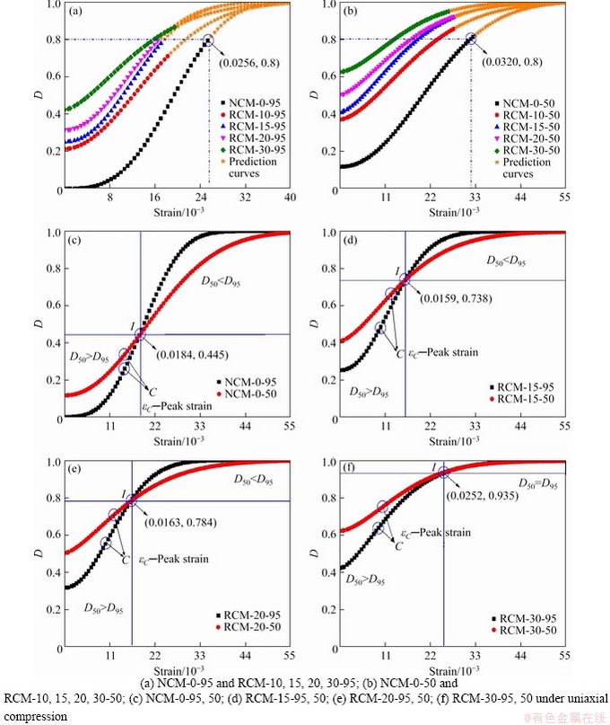 For the two curing humidity levels, the damage variables of each group of specimens show a monotonous, approximately “S”-shaped increase with strain. When the strain reaches 0.032, the damage variables for each group are more than 0.8, and gradually approach 1 with the increase of strain. For both curing humidity levels, when the strain is 0, the corresponding initial damage value increases with rubber content. For specimens with the same rubber content, when the strain is 0, the corresponding initial damage value increases with the decrease of curing humidity.