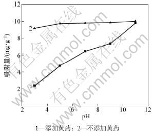 设置Pb2+质量浓度为100 mg/L,黄药质量浓度分别为0和20 mg/L,以3%盐酸溶液或0.5 mol/L氢氧化钠溶液调节pH分别为3,5,7,9和11,参照上述方法进行实验和分析,并测定平衡溶液pH。