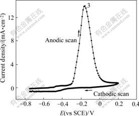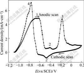 The CV tests were performed at the scan rate of 10 mV/s in the solution of 16.8 g/L THPED, 5 mg/L α, α′- bipyridyl, 1 g/L PEG-1000(polyethylene glycol) and 2 mg/L 2-MBT(2-mercaptobenzo-thiazole) at the pH value of 13.0. The result is shown in Fig.1. The CV curve of sample with 5.0 g/L HCHO is shown in Fig.2.