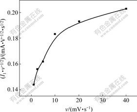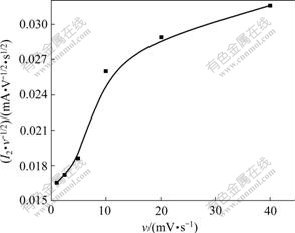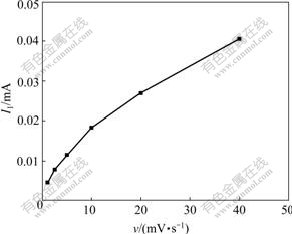 The curves of I1 vs v and I1/v1/2 vs v of Peak 1 are shown in Fig.3 and Fig.4, respectively. It can be seen from Fig.3 that the peak current I1 is positively proportional with scan rate v under high scan speed. It can be seen from Fig.4 that peak current function I1/v1/2 increases with the increase of v, which is different from the eight instances described in “Electrochemical spectrum”[10]. GU[11] and PAUNOVIC[12] reported that it is the characteristic of surface adsorption of electronic active material.