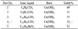 ZHAO et al [14] suggested that ionic liquid can dissolve glucose and enhance the acid-catalyzed decomposition of glucose. According to their experiment, the ionic liquid [AMIM]Cl showed higher excellent solubility to salts and glucose. In this work, the ionic liquid [OMIM]Cl was used as solvent to enhance the yield of lactic acid for the glucose decomposition reaction.